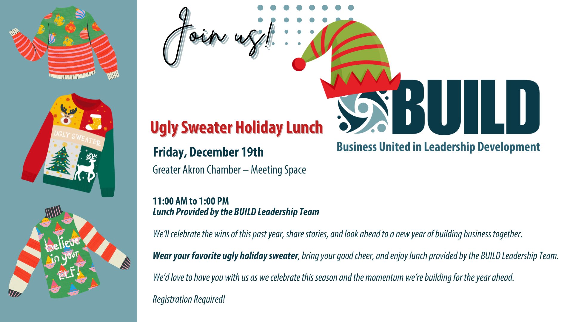 Wear your favorite ugly holiday sweater, bring your good cheer, and enjoy lunch provided by the BUILD Leadership Team.